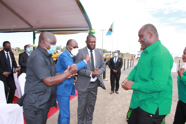Katibu Mkuu wa Chama cha mapinduzi CCM Ndugu Daniel Chongolo akisalimiana na Waziri wa Ujenzi na Uchukuzi Profesa Makame Mbarawa katikati, Mh.Suleiman Kakoso Mwenyekiti wa Kamati ya Bunge ya kudumu ya Miundombinu na Mh. Ayeshi mjumbe wa kamati hiyo na Mbunge wa jimbo la Sumbawanga mjini.