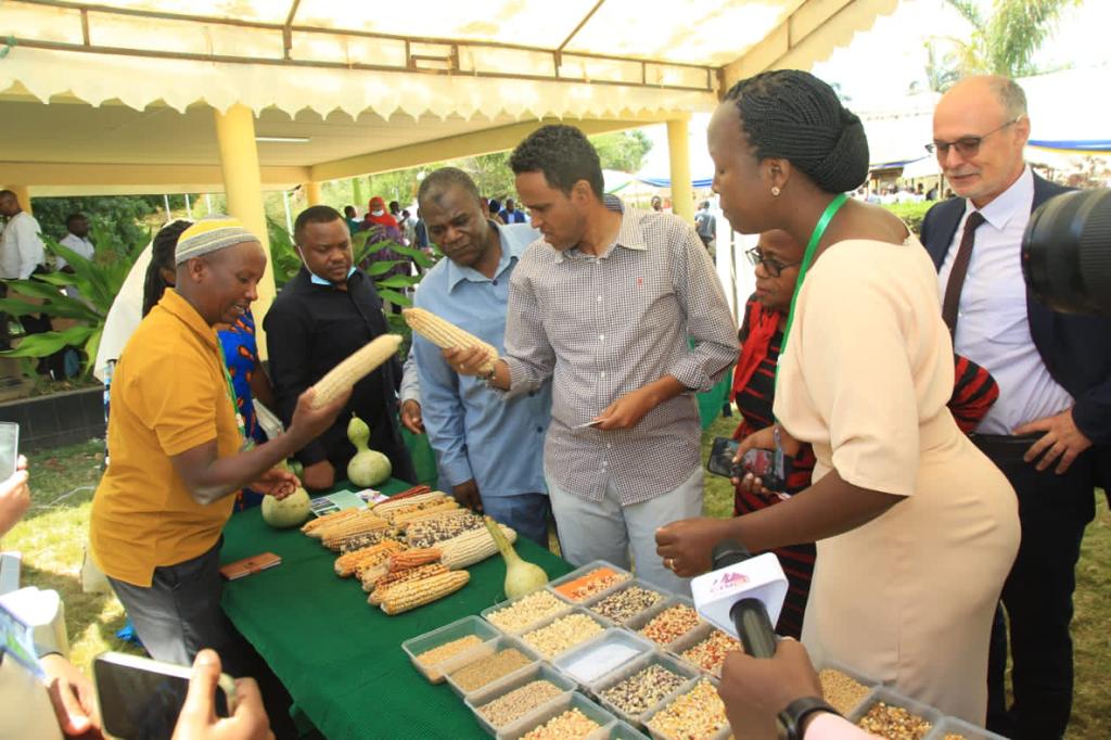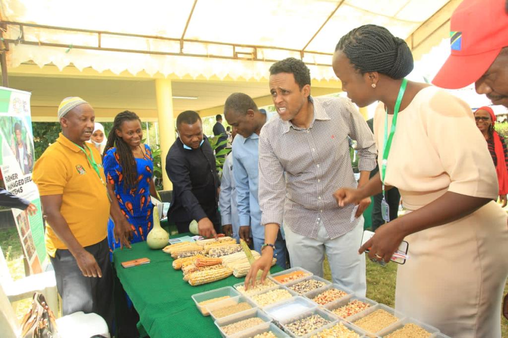 Naibu Waziri wa Kilimo Mhe. Hussein Bashe akiangalia nafaka zilizohifadhiwa kwa kutumia dawa asilia bila kutumia kemikali katika banda la Iles De Paix wakati wa Mkutano wa pili wa Kitaifa unao hamasisha kilimo asilia(Ecological Organic Agriculture) unaofanyika jijini Dodoma kwa siku mbili.