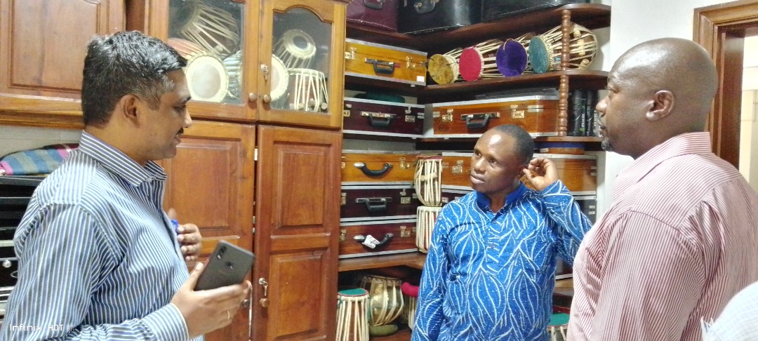- Kushoto ni Mwambata wa Utamaduni wa Ubalozi wa India nchini Mhe Santhosh G. Raja akielezea kwa wajumbe wa kamati ya Museum Art Explosion (MAE) vifaa vya muziki wa asali, katikani ni Mkuu wa Idara ya Program Makumbusho na Nyumba ya Utamaduni Dar es Salaam Bw Chance Ezekiel na kulia ni Mjumbe wa MAE Bw Anastasius Liwewa