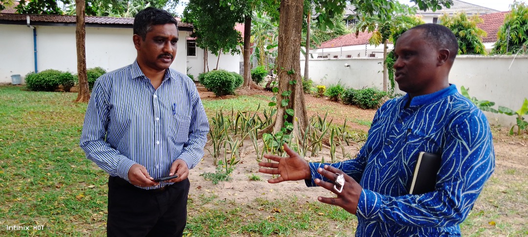 Mkuu wa Idara ya Program Bw Chance Ezekiel akifafanua jambo kwa Mwambata wa Utamaduni wa Ubalozi wa India nchini Mhe Santhosh G. Raja
