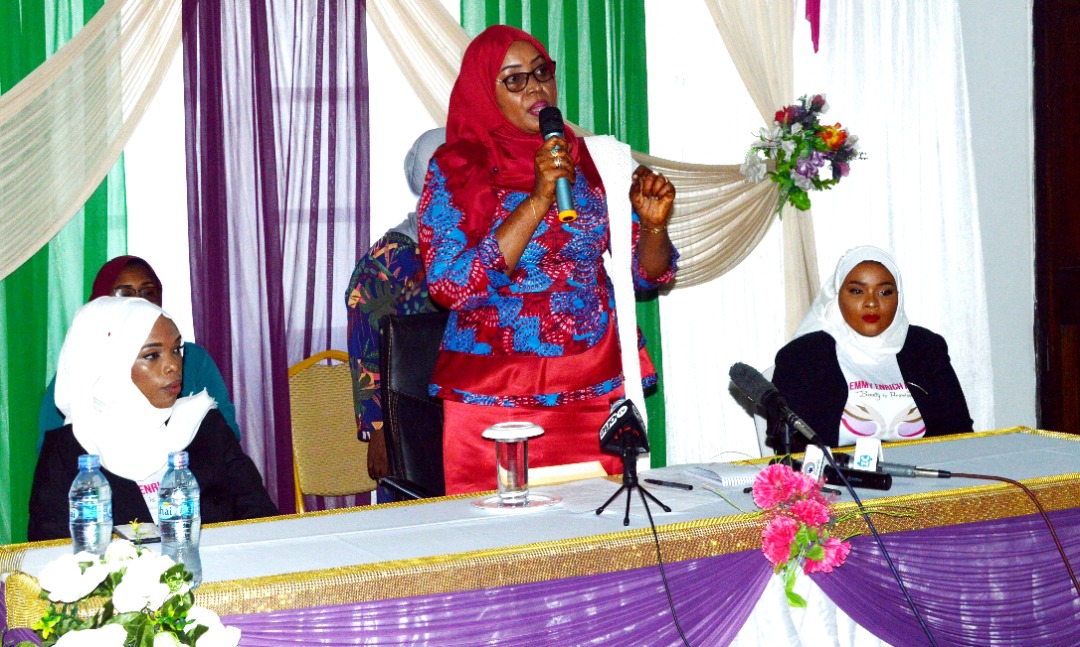 Mke wa Makamo wa Kwanza wa Rais wa Zanzibar Mama Zainab Kombo akizungumza katika Ufungaji wa Mafunzo ya Upambaji huko Ukumbi wa Sanaa Rahaleo Mjini Zanzibar.