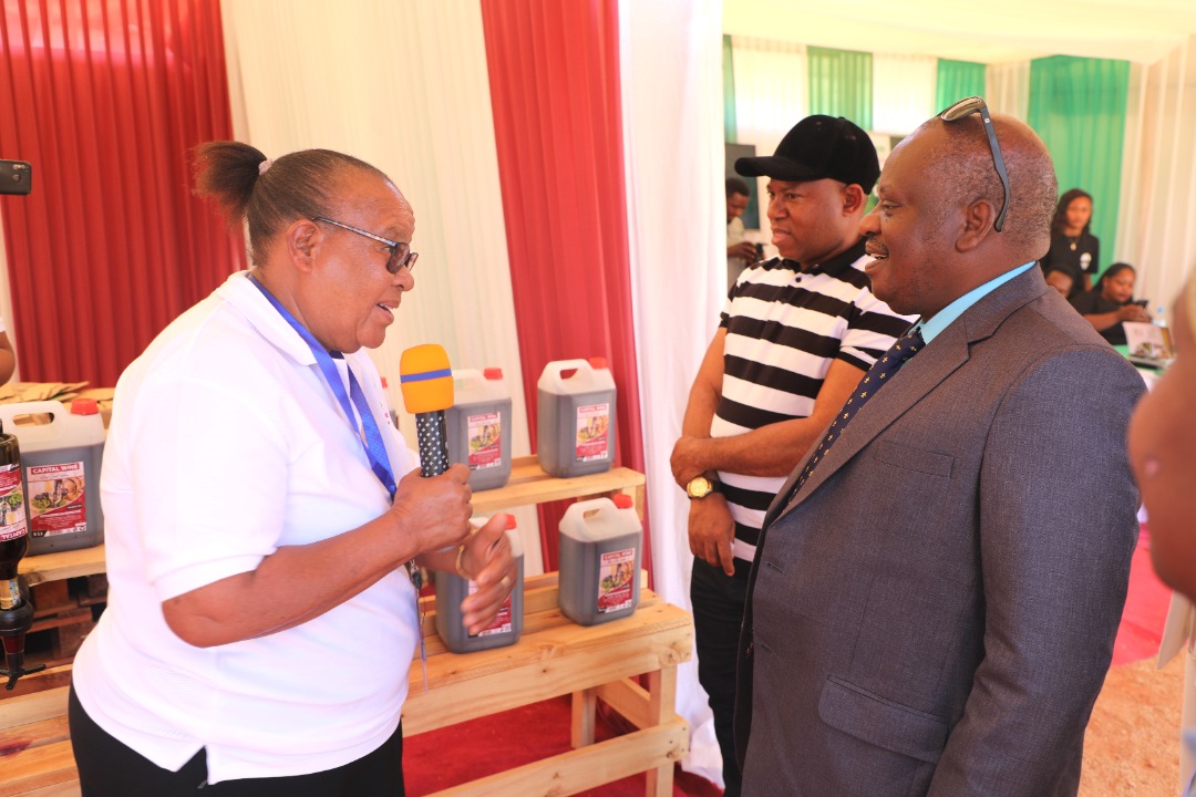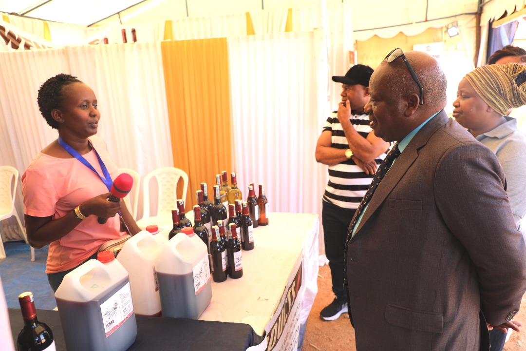 Spika wa Bunge, Mhe. Job Ndugai akimsikiliza Mkurugenzi Mkuu wa Capital Wine, Bi. Esther Rogati wakati alipotembelea Banda la kampuni hiyo leo katika siku ya Tamasha la Mvinyo (Wine festival) linaloendelea katika Viwanja vya Mashujaa Jijini Dodoma, Novemba 6, 2021