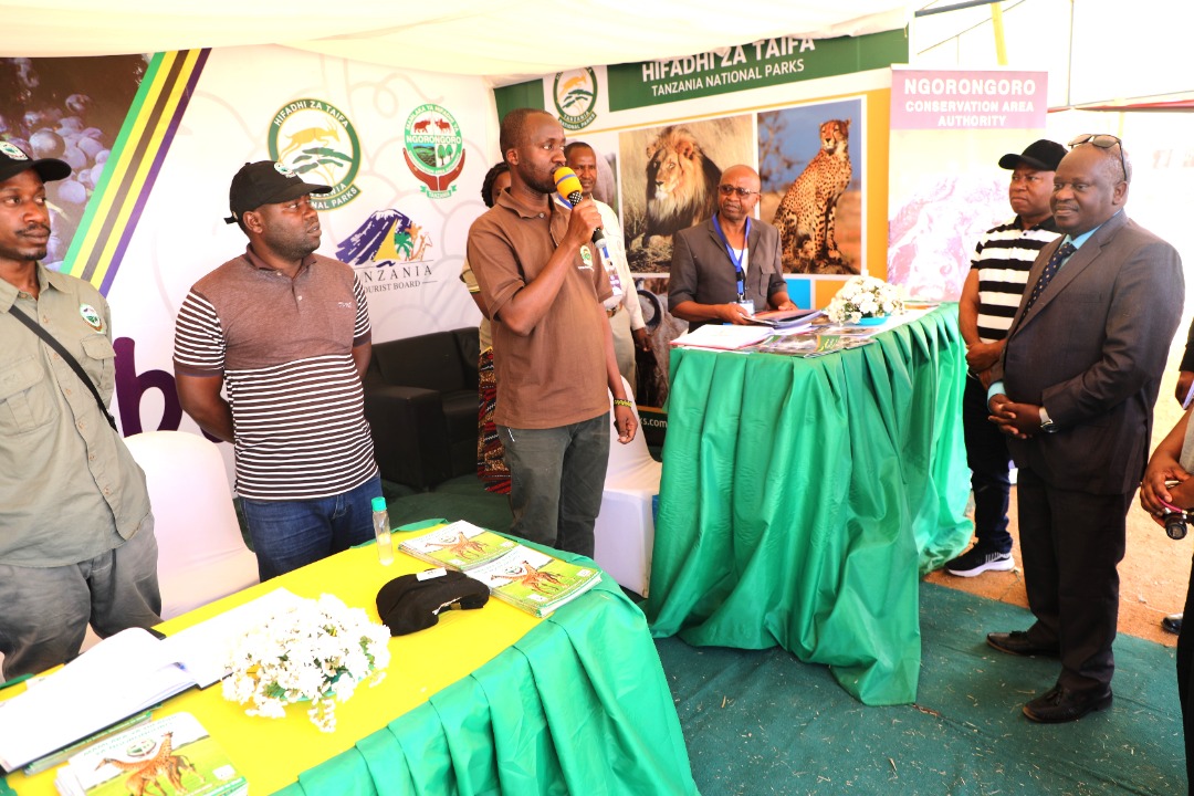 Spika wa Bunge, Mhe. Job Ndugai akimsikiliza Afisa utalii Mwandamizi Wizara ya Maliasili na Utalii, Bw. Reuben Rwiza wakati alipotembelea Banda la hilo leo katika siku ya Tamasha la Mvinyo (Wine festival) linaloendelea katika Viwanja vya Mashujaa Jijini Dodoma, Novemba 6, 2021