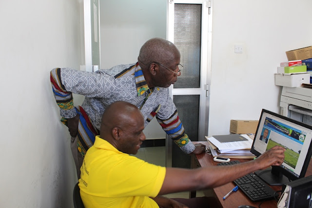 Mkuu wa kitengo cha ICT, GEOFREY MWAKIJUNGU (aliyekaa) akimwonyesha Mwenyekiti wa Bodi ya Tume Prof, Mahoo baadhi ya matukio katika Tovuti ya Tume.