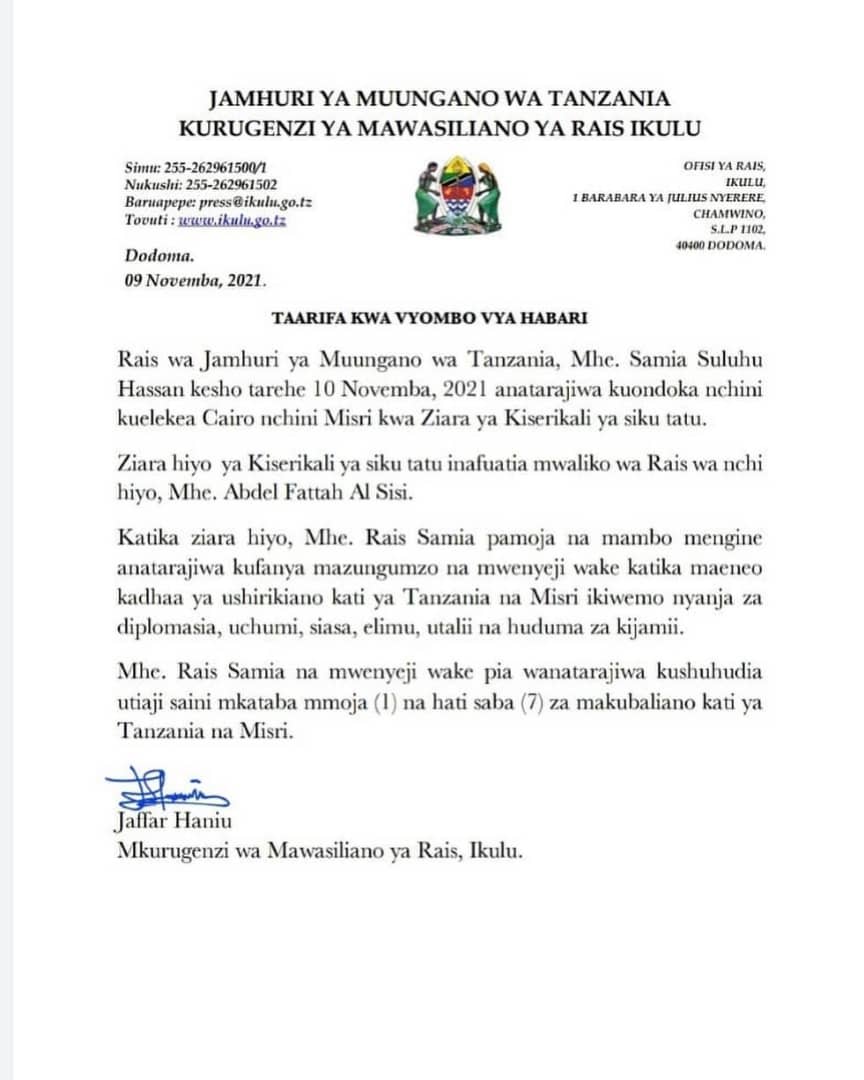 MchanganyikoRAIS SAMIA KUONDOKA KESHO NCHINI KUELEKEA CAIRO NCHINI MISRI KWENYE ZIARA YA KISERIKALI Last updated: 2021/11/09 at 3:23 PM joseph 4 years ago Share SHARE joseph November 9, 2021 November 9, 2021 Share this Article Facebook Twitter Email Print Previous Article BODI YA NAFAKA NA MAZAO MCHANGANYIKO (CPB) KUUZA NAFAKA NCHINI KENYA Next Article TANZANIA YAWAHIMIZA DIASPORA WA TANZANIA KUCHANGAMKIA FURSA ZA UWEKEZAJI ZILIZOPO NCHINI