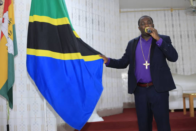 Askofu Kiongozi wa Kanisa la Abundant Blessing Center (ABC) la Tabata jijini Dar es Salaam, Flaston Ndabila akiliombea Taifa kwa kuishika bendera ya Taifa katika maombi hayo maalumu.