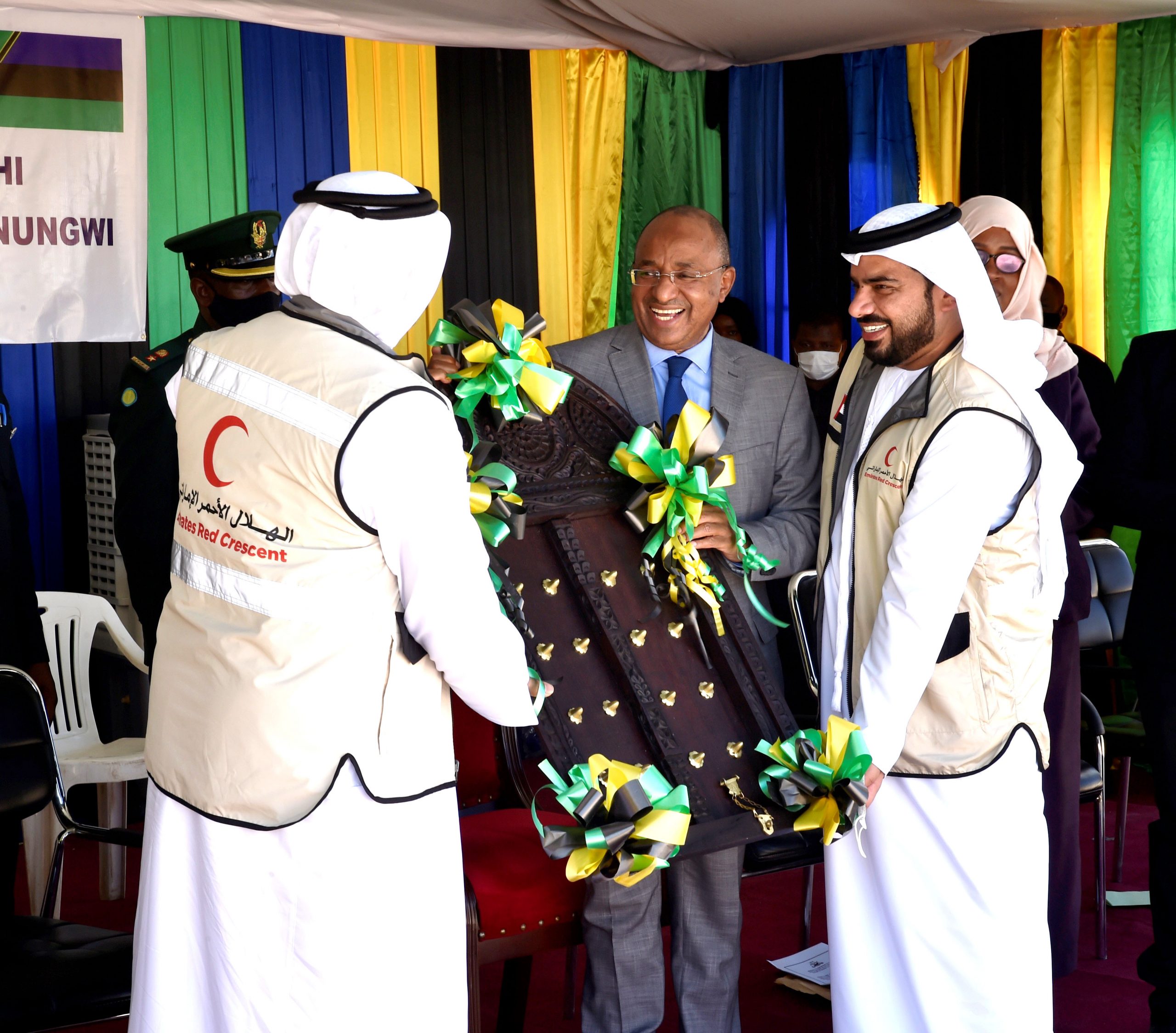 Rais wa Zanzibar na Mwenyekiti wa Baraza la Mapinduzi Dk.Hussein Ali Mwinyi (katikati) akikabidhi zawadi ya Mlango wa Zanzibar (ZANZIBAR DOOR) kwa Balozi wa Nchi za Falme za Kiarabu (UAE) Nchini Tanzania Mhe.Khalifa Abdulrahman ALMarzouqi (kushoto) na Naibu katibu Mkuu wa Red Cresscent Bw.Humud Al- Junaibi (Wafadhili) katika sherehe ya Uzinduzi wa Nyumba za Vijiji za Wananchi walioathirika na Mvua za masika mwaka 2017, hafla iliyofanyika leo katika Kijiji cha Nungwi Mkoa wa Kaskazini Unguja.[Picha na Ikulu] 23 Nov 2021.