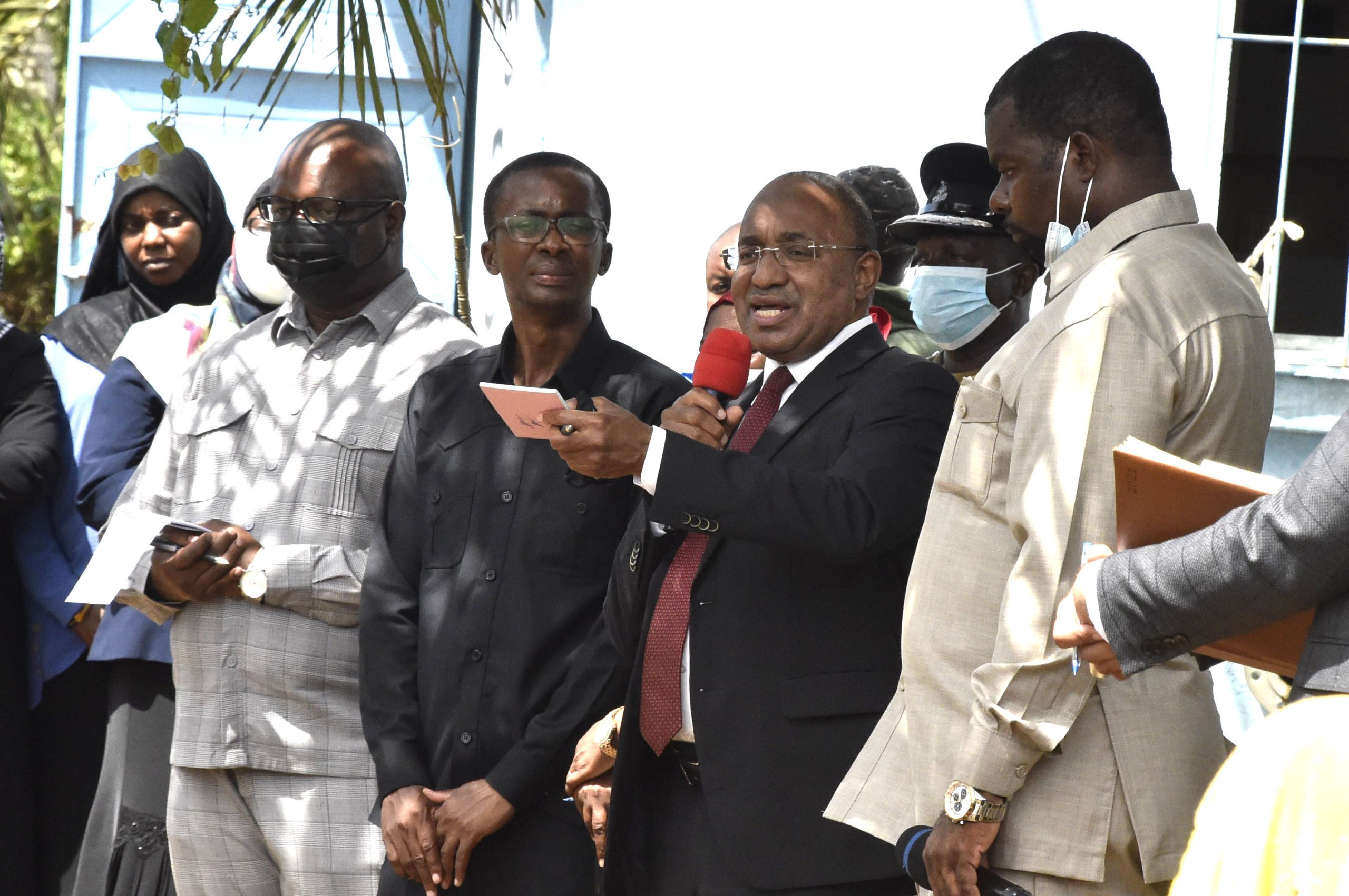 Rais wa Zanzibar na Mwenyekiti wa Baraza la Mapinduzi Dk.Hussein Ali Mwinyi (kushoto) akisisitiza jambo kwa watendaji wakati alipofanya ziara ya Ghafla kwa kutembelea visima vya Maji Safi na Salama Bumbwisudi Wilaya ya Magharibi “A” Mkoa Mjini Magharibi leo (katikati) Waziri wa Maji,Nishati na Madini Mhe.Suleiman Masoud Makame,(wa tatu kulia) Mkuu wa Wilaya ya Magharibi”A” Mhe.Suzan Peter Kunambi.[Picha na Ikulu] 25/11/2021.