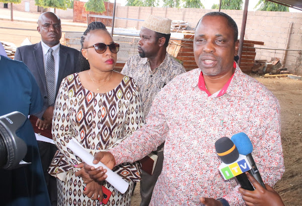 Mkurugenzi wa Huduma za Mifugo kutoka Wizara ya Mifugo na Uvuvi, Prof. Hezron Nonga akionesha kitu kwenye kiwanda cha Uchinjaji, Uchakataji na Usafirishaji wa nyama ya Punda cha Fang Hua Investment Co. Ltd kilichopo Ibadakuli Mjini Shinyanga.