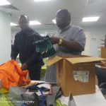 Mwanafunzi Rashid Sudi, akiwa amebeba kifaa cha kutambua iwapo gesi imepungua katika vifaa vya kuhifadhia, wa pili kulia ni Naibu Katibu Mkuu Fedha na Mipango, Dkt. Khatibu Kazungu akishuhudia.