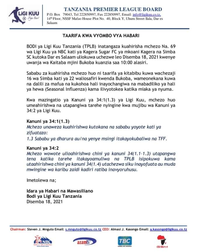 MichezoMECHI YA KAGERA SUGAR NA SIMBA YAAHIRISHWA Last updated: 2021/12/18 at 12:31 PM joseph 4 years ago Share SHARE joseph December 18, 2021 December 18, 2021 Share this Article Facebook Twitter Email Print Previous Article WAZIRI UMMY ATAKA FEDHA ZA MAPATO YA NDANI KUTEKELEZA MIRADI YENYE TIJA Next Article RAIS DK.MWINYI AHUDHURIA KIKAO CHA HALMASHAURI KUU YA CCM JIJINI DODOMA