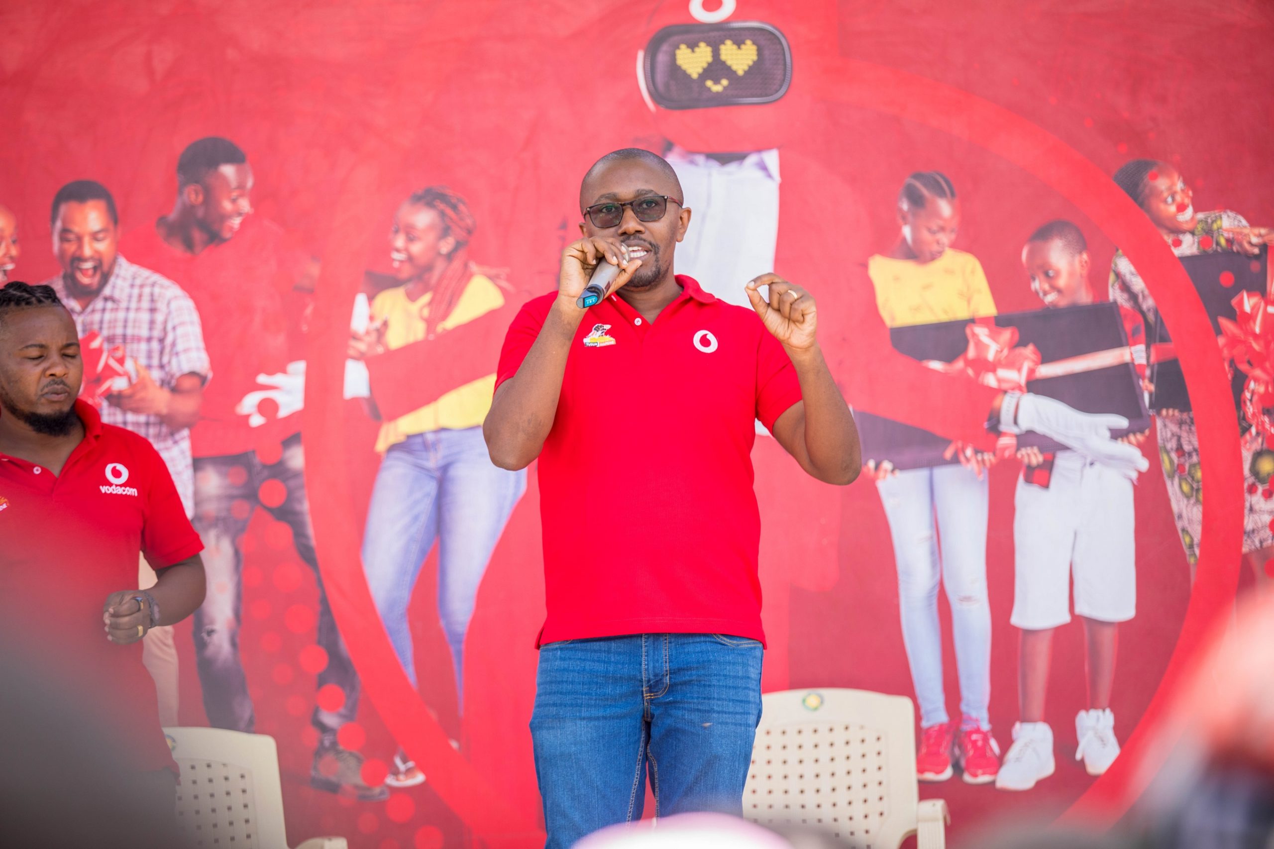 Mkuu wa kitengo cha huduma za kidigitali Vodacom Tanzania, Goodluck Moshi akizungumza na wakazi wa Mbagala waliojitokeza kushuhudia makabidhiano ya zawadi kwa mshindi wa promosheni ya Vodacom Tusua mapene, Lilian Haule ambaye amejishindia shilingi milioni kumi kutoka Vodacom.