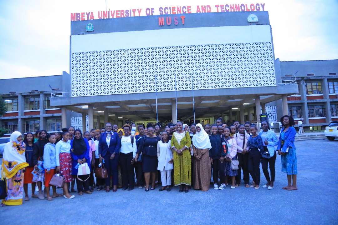 Wahandisi wanawake kutoka Wizara ya Ujenzi na Uchukuzi,(Sekta ya Ujenzi), kitengo maalumu cha ushirikishwaji wa wanawake katika kazi za barabara, wakiwa katika picha ya pamoja na Wanafunzi wa Chuo cha Sayansi na Teknolojia (MUST), jijini Mbeya mara baada ya kutoa elimu inayohusiana na masuala ya Ujenzi, ikiwemo Uhandisi, Ubunifu Majengo na Ukadiriaji Majenzi.