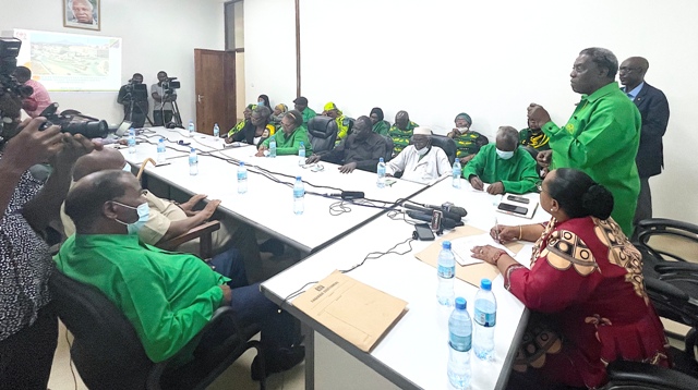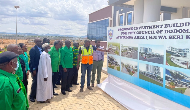 Wajumbe wa Baraza la wazee wa Chama cha Mapinduzi (CCM) Wilaya ya Dodoma Mjini wakipata maelezo juu ya ujenzi wa miradi ya ukumbi wa mikutano na hoteli inayojengwa na Halmashauri ya Jiji la Dodoma katika eneo la mji wa Serikali Mtumba Jijini Dodoma