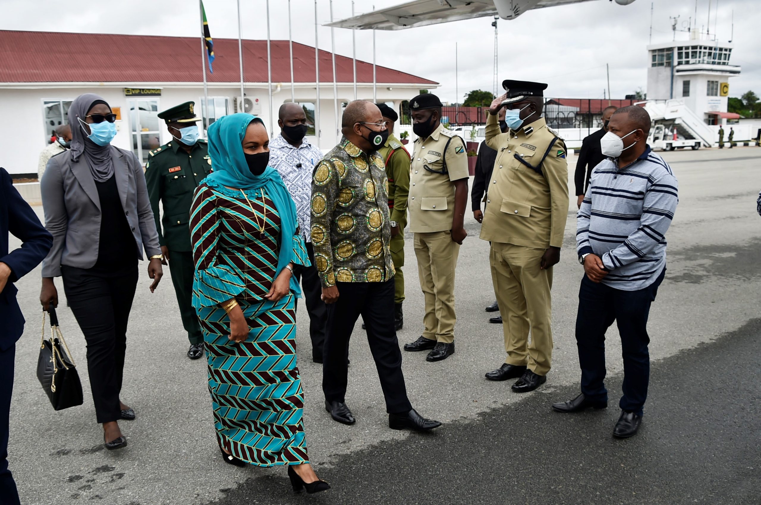 RAIS wa Zanzibar na Mwenyekiti wa Baraza la Mapinduzi Mhe. Dk. Hussein Ali Mwinyi akiwa na Mkewe Mama Mariam Mwinyi, wakiwasalimia na kuagana na Wakuu wa Vikosi vya Ulinzi na Usalama Mkoani Dodoma katika Uwanja wa Ndege wa Dodoma akielekea Zanzibar,baada ya kumalizika kwa ufunguzi wa Wiki ya Sheria Tanzania uliofanyika katika viwanja vya Nyerere Square Jijini Dodoma