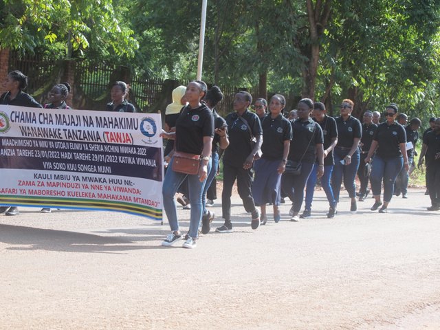 Baadhi ya Mahakimu na Majaji wa Chama cha Mahakimu na Majaji Wanawake Tanzania Kanda ya Songea wakishiriki matembezi ya km4 wakati wa Uzinduzi wa Maadhimisho ya wiki ya utoaji elimu ya sheria,ya wiki ya Utoaji elimu ya Sheria mkoani Ruvuma.
