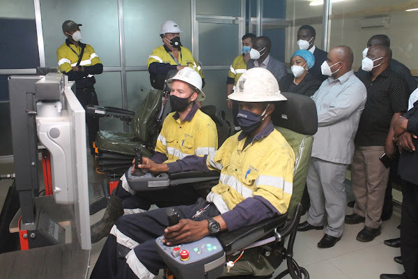 Rais na Ofisa Mtendaji Mkuu wa Barrick, Mark Bristow (kushoto) akiwaeleza Waziri wa Madini,Dk. Doto Biteko, Waziri wa Tamisemi, Innocent Bashungwa, Mkuu wa Mkoa wa Shinyanga, Sophia Mjema (wa nne kushoto) jinsi mtambo wa kielekitroniki wa uchumbaji madini chini ardhi unavyofanya kazi wakati wa kutangaza uzalishaji wa dhahabu kufikia wakia 500,000 kwa migodi North Mara na Bulyanhulu mwishoni wa mwaka 2021.