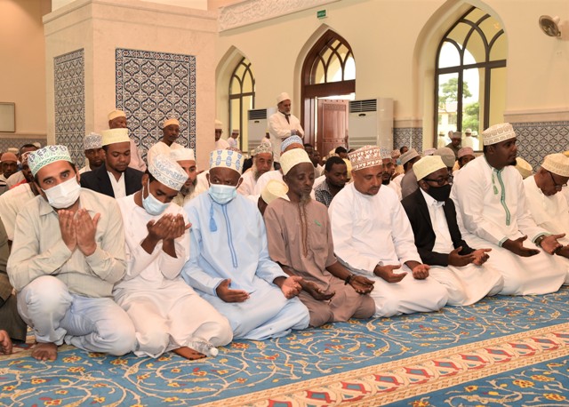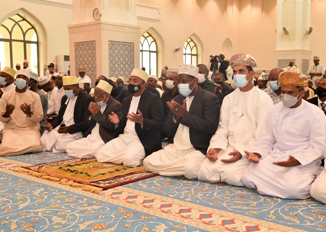 RAIS wa Zanzibar na Mwenyekiti wa Baraza la Mapinduzi Alhaj Dk.Hussein Ali Mwinyi akiitikia dua ikisomwa na Mufti Mkuu wa Zanzibar Sheikh Saleh Omar Kabi. (kulia kwa Rais) baada ya kumalizika kwa Sala ya Ijumaa iliyofanyika katika Masjid Jamiu Zinjibar Mazizini Wilaya ya Magharibi “B” Unguja na (kushoto kwa Rais) Mstahiki Meya wa Jiji la Zanzibar Mahmoud Mohammed Mussa.(Picha na Ikulu)