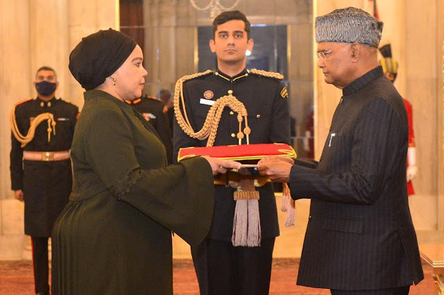 Balozi wa Tanzania nchini India, Mhe. Anisa K. Mbega amewasilisha Hati za Utambulisho kwa Rais wa India, Mhe. Ram Nath Kovind , Ikulu (Rashtrapati Bhavan), mjini New Delhi leo tarehe 16 Februari 2022. Baada ya kuwasilisha Hati hizo, Balozi Anisa Mbega alifanya mazungumzo na Mhe. Rais Kovind.