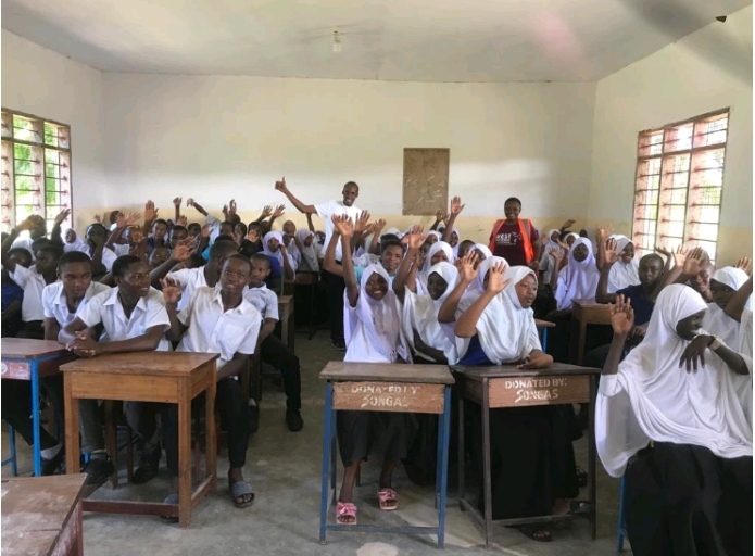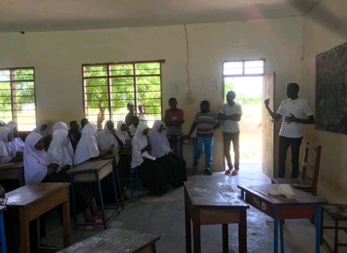 Mjiolojia Ebeneza Mollel kutoka PURA akiwaeleza wanafunzi wa Shule ya Sekondari ya Songo Songo kuhusu PURA na Mkondo wa Juu wa Petroli kufuatia ziara waliyoifanya shuleni hapo