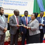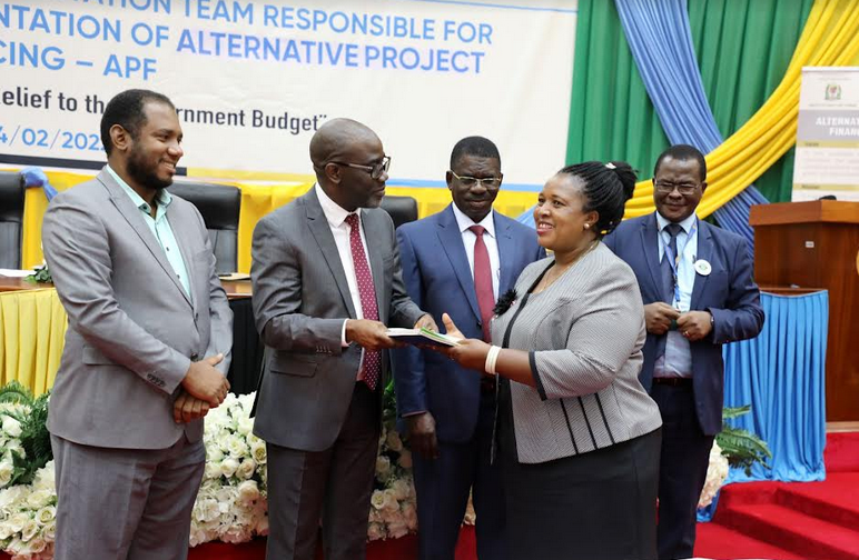 Naibu Katibu Mkuu Wizara ya Fedha na Mipango Bw. Lawrence Mafuru akimkabidhi vitendea kazi Kamishna Msaidizi Idara ya Maendeleo ya Sekta ya Fedha Wizara ya Fedha na Mipango Bi. Dionesia Mjema kwa niaba ya Timu ya Kitaifa iliyoundwa kwa ajili ya Kuwezesha Ugharamiaji wa Miradi ya Maendeleo kwa kutumia njia mbadala (Alternative Project Financing – APF National Facilitation Team). Kulia kwake ni Naibu Katibu Mkuu Wizara ya Fedha na Mipango Zanzibar Bw. Aboud Hassan Mwinyi, kushoto kwake ni Naibu Katibu Mkuu Ofisi ya Rais, Tawala za Mikoa na Serikali za Mitaa (TAMISEMI), Dkt. Sixbert Mkama pamoja na Kamishina wa Idara ya Maendeleo ya Sekta ya Fedha Wizara ya Fedha na Mipango, Dkt. Charles Mwamaja, Jijini Dodoma