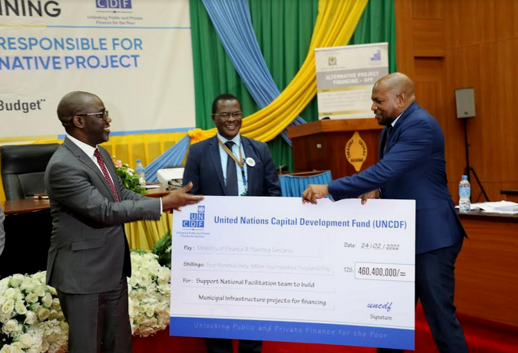 Naibu Katibu Mkuu Wizara ya Fedha na Mipango Bw. Lawrence Mafuru akipokea kwa niaba ya Serikali Hundi Kifani ya shilingi milioni 460.4 kutoka kwa Mwakilishi Mkazi wa Mfuko wa Maendeleo ya Mitaji wa Umoja wa Mataifa (UNCDF) Bw. Peter Malika, zitakazoiwezesha Timu ya Kitaifa iliyoundwa kwa ajili ya Kuwezesha Ugharamiaji wa Miradi ya Maendeleo kwa kutumia njia mbadala (Alternative Project Financing – APF National Facilitation Team) kutekeleza majukumu yake kikamilifu.