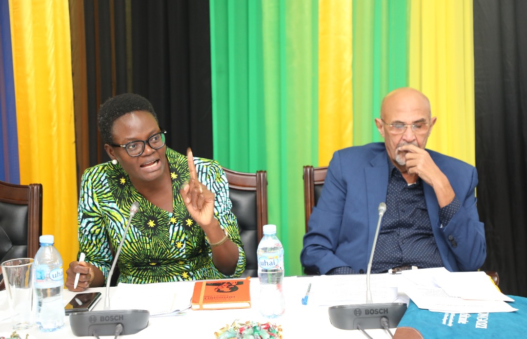 Spika wa Bunge, Mhe. Dkt. Tulia Ackson (Mb), akitolea ufafanuzi hoja mbalimbali za Wajumbe wa kamati ya uongozi, Makamu Wenyeviti wa kamati na Tume ya Utumishi wa Bunge katika semina ya mafunzo ya kuwajengea uwezo viongozi hao wa Wabunge yanayoendelea katika ofisi Ndogo za Bunge, Tunguu Zanzibar, Februari 24, 2022, kulia ni Naibu Spika wa Bunge la Jamhuri ya Muungano wa Tanzania, Mhe. Mussa Zungu (Mb)