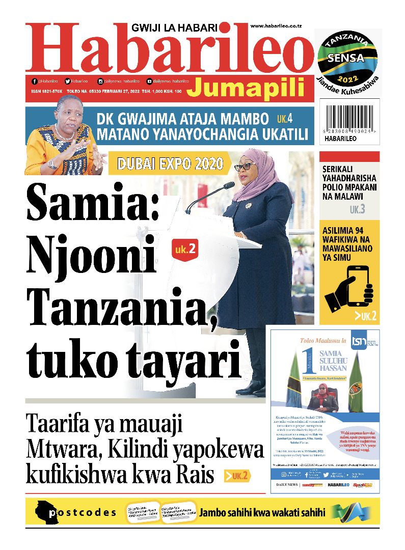 MagazetiPITIA VICHWA VYA HABARI KATIKA MAGAZETI YA LEO FEBRUARY 27,2022 Last updated: 2022/02/27 at 3:59 AM Alex Sonna 4 years ago Share SHARE Alex Sonna February 27, 2022 February 27, 2022 Share this Article Facebook Twitter Email Print Previous Article RAIS WA ZANZIBAR MHE.DK.HUSSEIN ALI MWINYI AONGOZA MAMIA WA WANANCHI WA KIJIJI CHA NYASUSURA MKOANI MARA Next Article TAARIFA YA UTEUZI KUTOKA KURUGENZI YA MAWASILIANO YA RAIS IKULU LEO