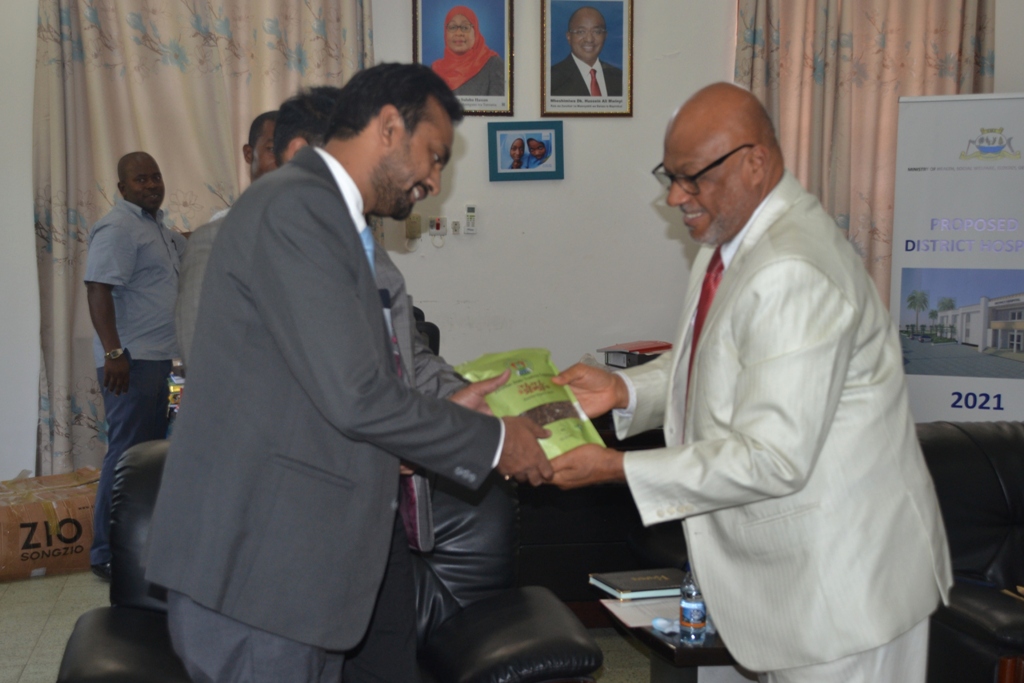 Waziri wa Afya, Ustawi wa Jamii , Wazee, Jinsia na Watoto Nassor Ahmed Mazrui akipokea zawadi maalum kutoka kwa mjumbe wa Hospital ya Wockhardt ya Nchini India Somnath Shetty, alipofika Ofisini kwake kujitbulisha .