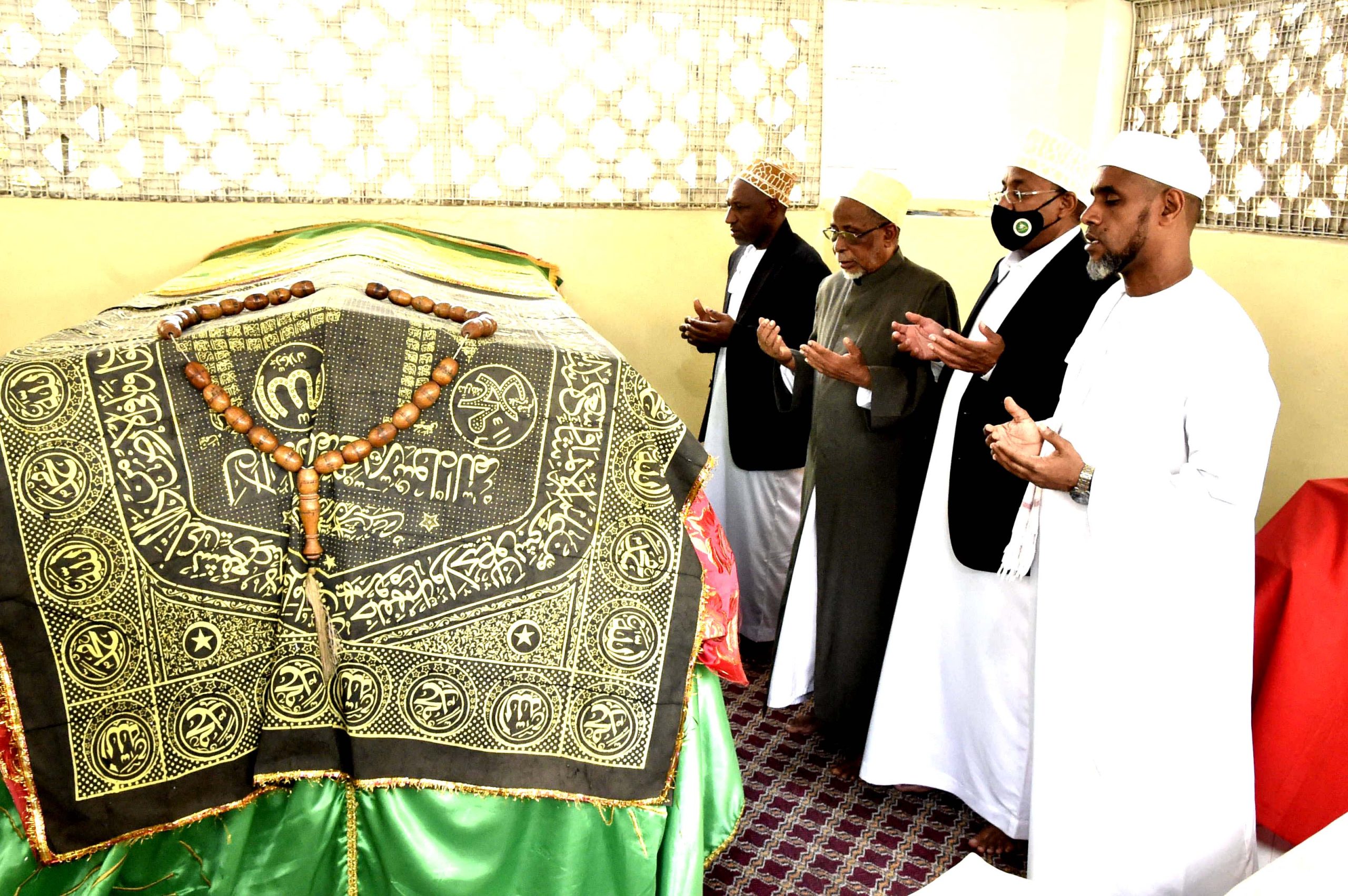 Rais wa Zanzibar na Mwenyekiti wa Baraza la Mapinduzi Alhaj Dk.Hussein Ali Mwinyi (wa pili kulia) akiitikia dua iliyoombwa na Mufti Mkuu wa Zanzibar Sheikh Saleh Omar kabi (katikati) katika makaburi ya wanazuoni mbali mbali waliozikwa katika Msikiti wa Ijumaa Malindi Jijini Zanzibar leo alipozuru makaburi hayo kabla ya kujumuika na Waislamu katika Sala ya Ijumaa (kulia) Sheikh Salum Hemed .