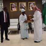 Balozi Liberata Mulamula akipokea zawadi kutoka kwa Shirikisho la wafanyabiashara na wenye viwanda nchini Saudi Arabia baada ya kikao na viongozi wa shirikisho hilo kilichofanyika katika Ofisi za Shirikisho hilo jijini Riyadh