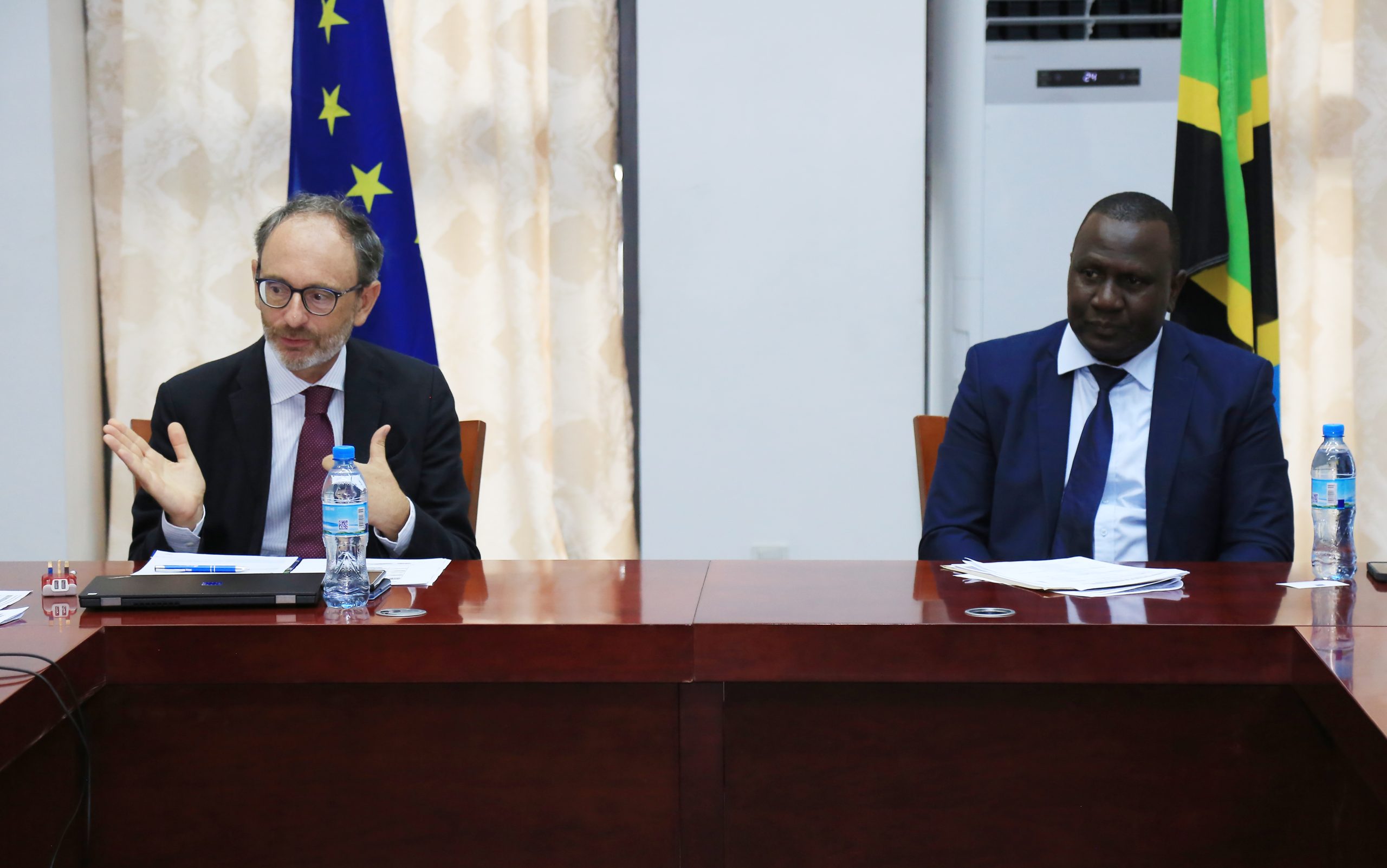 Balozi wa Umoja wa Ulaya nchini Mhe. Manfredo Fanti akiongea na washiriki wa kikao (hawapo pichani), kulia ni Katibu Mkuu wa Uwekezaji, Viwanda na Biashara Prof. Godius Kahyarara katika kikao kilichofanyika Jijini Dar es Salaam.