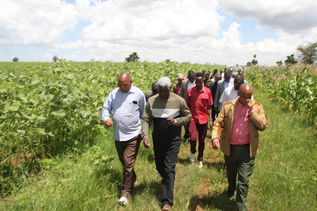 Ukaguzi wa mashamba hayo ukiendelea. Kutoka kushoto ni Diwani wa Kata hiyo Omari Mande, Mkuu wa Mkoa wa Singida, Dk.Binilith Mahenge na Mkulima wa Kata ya Mudida, Fr Pasian Mwanga -Paroko Parokia ya Mtinko.