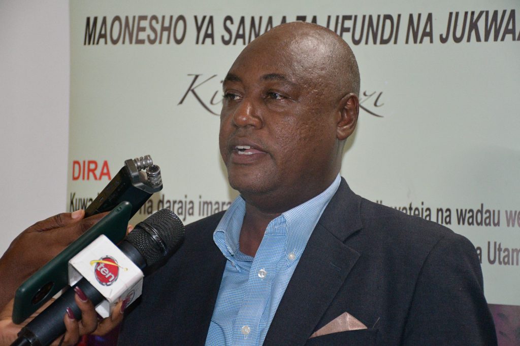 Mkurugenzi wa Makumbusho na Nyumba ya Utamaduni Bw Achiles Bufure, akiongea na waandishi wa Habari kwenye Maonesho ya Museum Arts Explosion, Makumbusho na Nyumba ya Utamaduni.