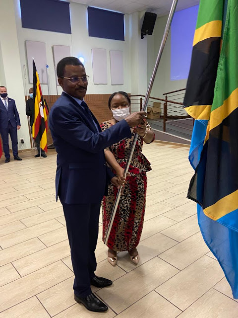 | Mwakilishi wa Kudumu wa Jamhuri ya Muungano wa Tanzania katika Umoja wa Afrika, Mhe. Balozi Innocent Shiyo akikabidhiwa Bendera ya Taifa kutoka kwa Mkuu wa Utawala wa Ubalozi wa Tanzania, Ethiopia, Bi. Elizabeth Rwitunga kama ishara ya kupokea rasmi majukumu ya Baraza la Amani na Usalama la Umoja wa Afrika Tanzania ikiwa miongoni mwa nchi 15 zinazounda Baraza hilo. Hafla hiyo imefanyika hivi karibuni jijini Maseru, Lesotho. Tanzania ilichaguliwa kuwa Mjumbe wa Baraza la Amani na Usalama la Umoja wa Afrika katika Mkutano wa 35 wa Wakuu wa Nchi na Serikali wa Umoja wa Afrika uliofanyika mwezi Februari 2022. Tanzania itahudumu kwenye Baraza hilo kwa kipindi cha miaka 2 kuanzia tarehe 01 Aprili 2022. |