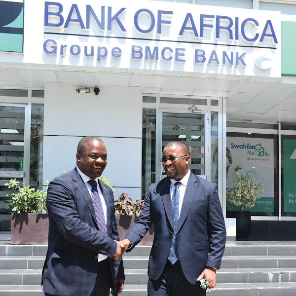 Mwenyekiti wa Bodi ya Wakurugenzi wa Bank of Africa Bw. Nehemia Kyando Mchechu akikaribishwa na Mkurugenzi na Afisa Mtendaji Mkuu wa Benki hiyo, Bw. Adam Mihayo wakati alipofanya ziara ya kikazi katika ofisi za makao makuu ya benki hiyo juzi.