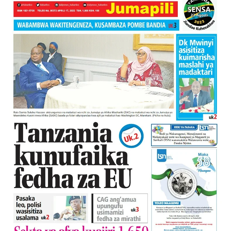 MagazetiPITIA VICHWA VYA HABARI KATIKA MAGAZETI YA LEO APRIL 17,2022 Last updated: 2022/04/16 at 11:36 PM Alex Sonna 4 years ago Share SHARE Alex Sonna April 16, 2022 April 16, 2022 Share this Article Facebook Twitter Email Print Previous Article MAMA KEVELA-KUNA UMUHIMU MKUBWA KWA WATANZANIA KUJITOKEZA KWENYE ZOEZI LA SENSA Next Article KIONGOZI WA MBIO ZA MWENGE AIPONGEZA RUWASA KUTEKELEZA MRADI WA MAJI NANGOMBA KWA WELEDI
