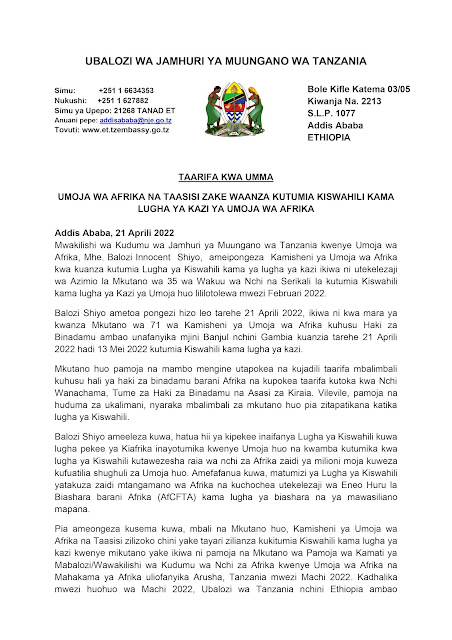 MchanganyikoUMOJA WA AFRIKA NA TAASISI ZAKE WAANZA KUTUMIA LUGHA YA KISWAHILI KAMA LUGHA YA KAZI Last updated: 2022/04/21 at 4:34 PM joseph 4 years ago Share SHARE joseph April 21, 2022 April 21, 2022 Share this Article Facebook Twitter Email Print Previous Article WABANDIKA KOPE MACHONI HATARINI KUPATA UPOFU. Next Article JAMII YATAKIWA KUUNGA MKONO SHUGHULI ZA MAENDELEO