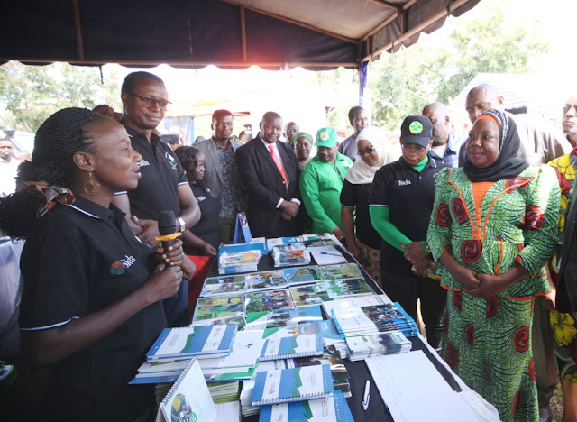 | Mgeni Rasmi, kwenye Maadhimisho ya Juma la Elimu kitaifa Mkuu wa Wilaya ya Igunga, Bi. Sauda Mtondoo aliyemwakilisha Mkuu wa Mkoa wa Tabora, akiongozana na Mratibu wa Mtandao wa Elimu Tanzania (TEN/MET), Bw. Ochola Wayoga (kushoto) pamoja na meza kuu wakitembelea banda la Uwezo Tanzania kwenye hafla ya uzinduzi wa Jumala Elimu iliyofanyika Viwanja vya Shule ya Msingi Mwenge wilayani Igunga. |