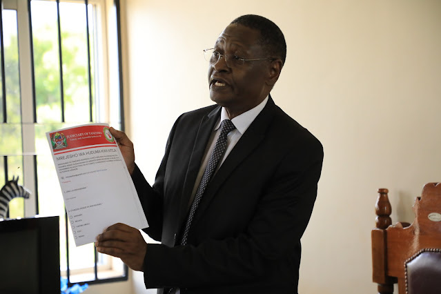 Jaji Mkuu wa Tanzania, Mhe. Prof. Juma akionyesha fomu maalum ya Mahakama kwa ajili ya kutoa maoni wakati alipokuwa katika Ofisi ya Mkuu wa Wilaya ya Pangani.
