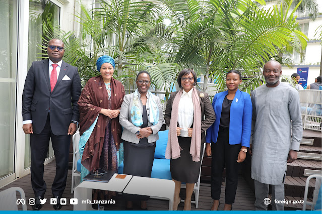 Waziri wa Mambo ya Nje na Ushirikiano wa Afrika Mashariki, Balozi Liberata Mulamula akiendelea na mazungumzo na Naibu Katibu Mkuu wa Umoja wa Mataifa, Mhe, Amina Mohammed (mwenye kilemba). Wengine wanaofuatilia ni Mkurugenzi wa Idara ya Ushirikiano wa Kimataifa katika Wizara ya Mambo ya Nje na Ushirikiano wa Afrika Mashariki, Balozi, Robert Kahendaguza; Mkurugenzi wa Kitengo cha Mawasiliano ya Serikali, Balozi Mindi Kasiga na Afisa Dawati, Bi. Gloria Ngaiza.
