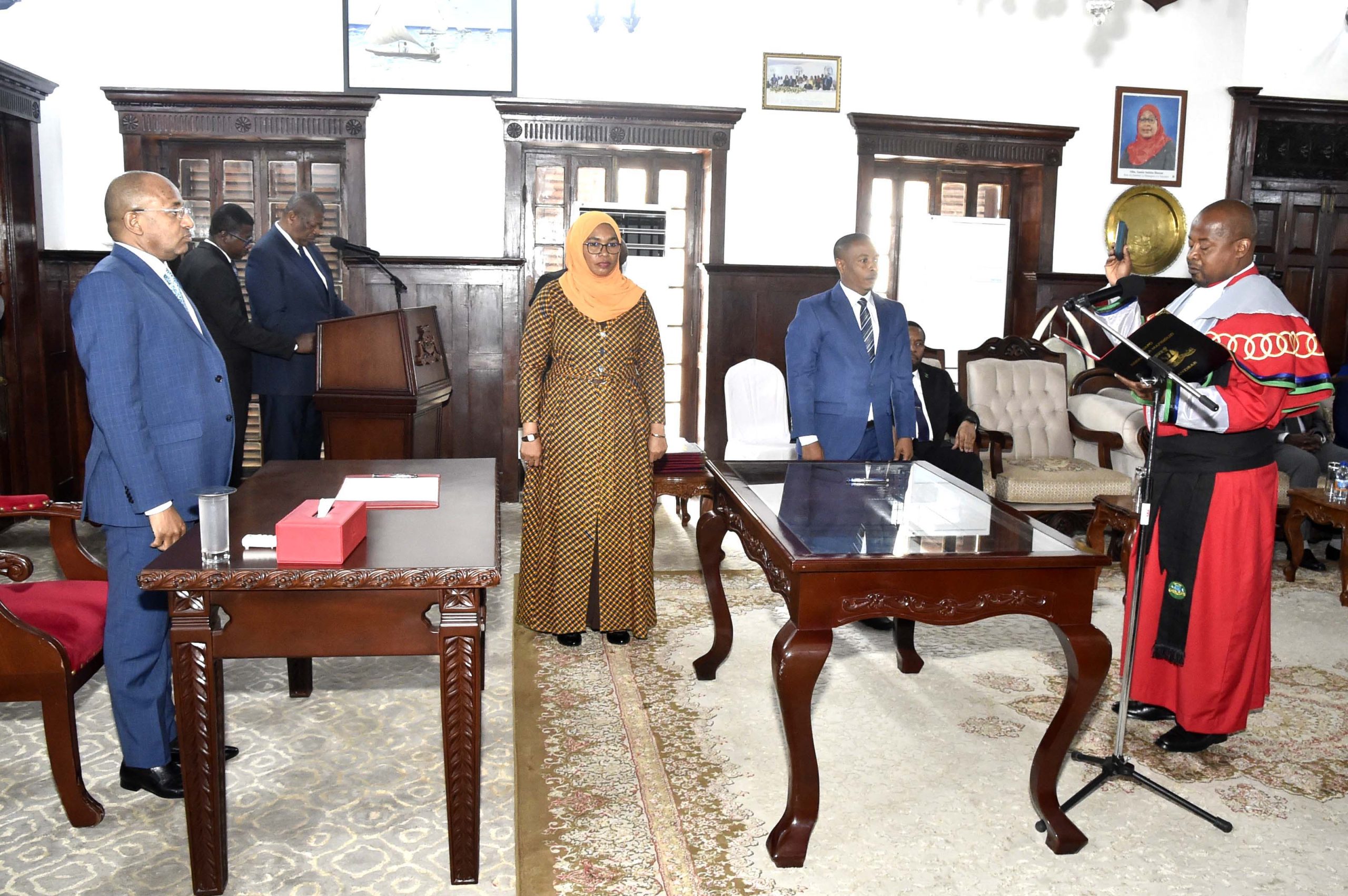 Rais wa Zanzibar na Mwenyekiti wa Baraza la Mapinduzi Dkt.Hussein Ali Mwinyi (kushoto) akimuapisha Mhe.Khamis Ramadhan Abdalla (kulia)kuwa Jaji Mkuu wa Zanzibar katika hafla iliyofanyika leo katika Ukumbi wa Ikulu Jijini Zanzibar kabla uteuzi alikaimu nafasi hiyo.