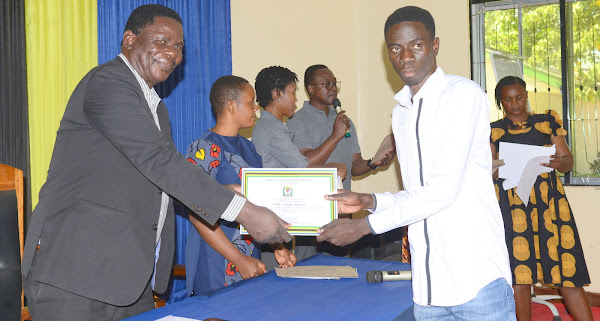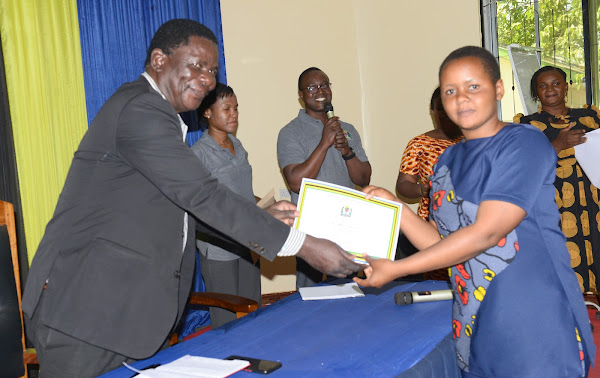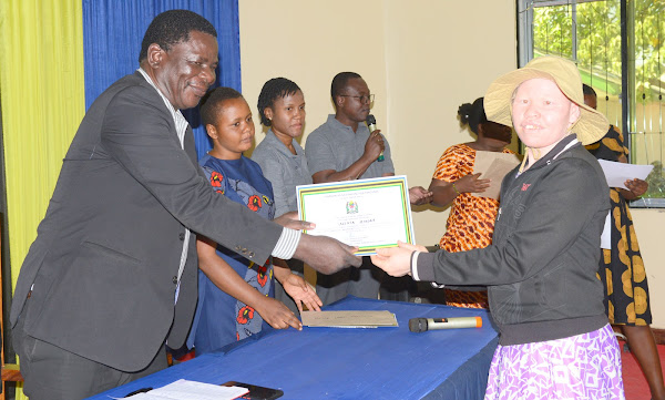 Kaimu Mkurugenzi Idara ya Maendeleo ya Vijana kutoka Ofisi ya Waziri Mkuu (Kazi, Vijana, Ajira na Wenye Ulemavu) Bw. Julius Tweneshe akigawa cheti kwa mnufaika wa mafunzo ya Ujuzi Tepe wakati wa Kuhitimisha ya Mafunzo hayo kwa Makundi Maalumu ya Vijana Wenye Ulemavu, wanaoishi na Virusi vya Ukimwi (WAVIU) na Wamama Wadogo (Young Mothers) yanayohusu masuala ya Ujasiriamali, Usimamizi wa Biashara, Kujitambua, Afya ya Uzazi na Ujinsia