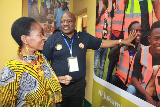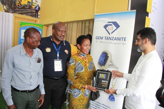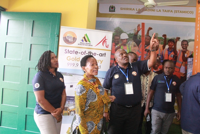 Waziri Mstaafu wa Ardhi Nyumba na Makazi Profesa Anna Tibaijuka akipata maelezo kutoka kwa Meneja Masoko na Uhusisono wa Shirika la Madini Tanzania STAMICO Bw, Geofrey Meena kulia ni Bw. Oto kutoka STAMICO na Kushoo ni Bibiana Ndumbaro Aisa habari wa STAMICO.