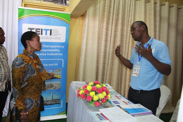 Waziri Mstaafu wa Ardhi Nyumba na Makazi Profesa Anna Tibaijuka akipata maelezo kutoka kwa Eric Ketagory Afisa Usimamizi wa Fedha TEITI wakati alipotembelea banda la taasisi hiyo.