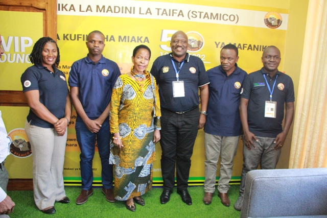 Profesa Anna Tibaijuka na Meneja Masoko na Uhusisono wa Shirika la Madini Tanzania STAMICO Bw, Geofrey Meena wakiwa katika picha ya pamoja na baadhi ya wafanyakazi wa STAMICO mara baada ya kutembelea banda la STAMICO leo.