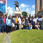 Profesa Anna Tibaijuka akiwa katika picha ya pamoja na wanamitindo wanaofanya kazi maalum katika banda la STAMICO mara baada ya kutembelea banda hilo leo.