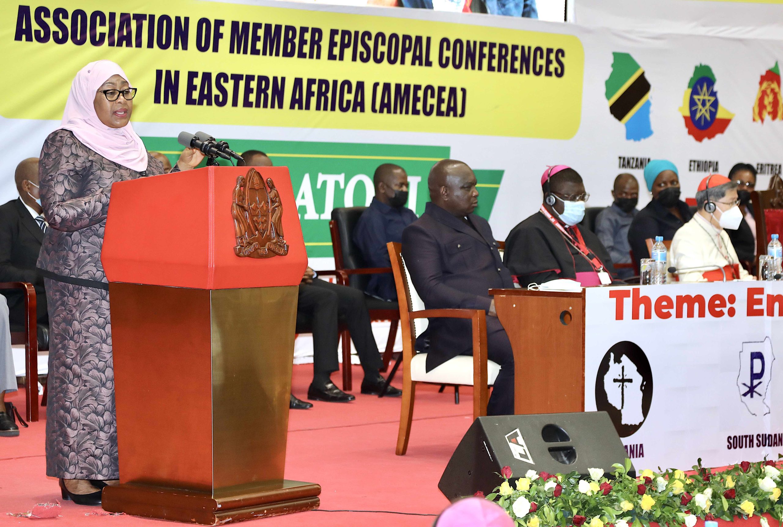 Rais wa Jamhuri ya Muungano wa Tanzania Mhe. Samia Suluhu Hassan akizungumza na Maaskofu kutoka nchi mbalimbali Barani Afrika pamoja na baadhi ya viongozi katika maadhimisho ya mkutano wa 20 wa Shirikisho la Mabaraza ya Maaskofu Katoliki Afrika Mashariki na Kati (AMECEA) uliofanyika kwenye ukumbi wa Julius Nyerere Convention Centre Jijini Dar es Salaam