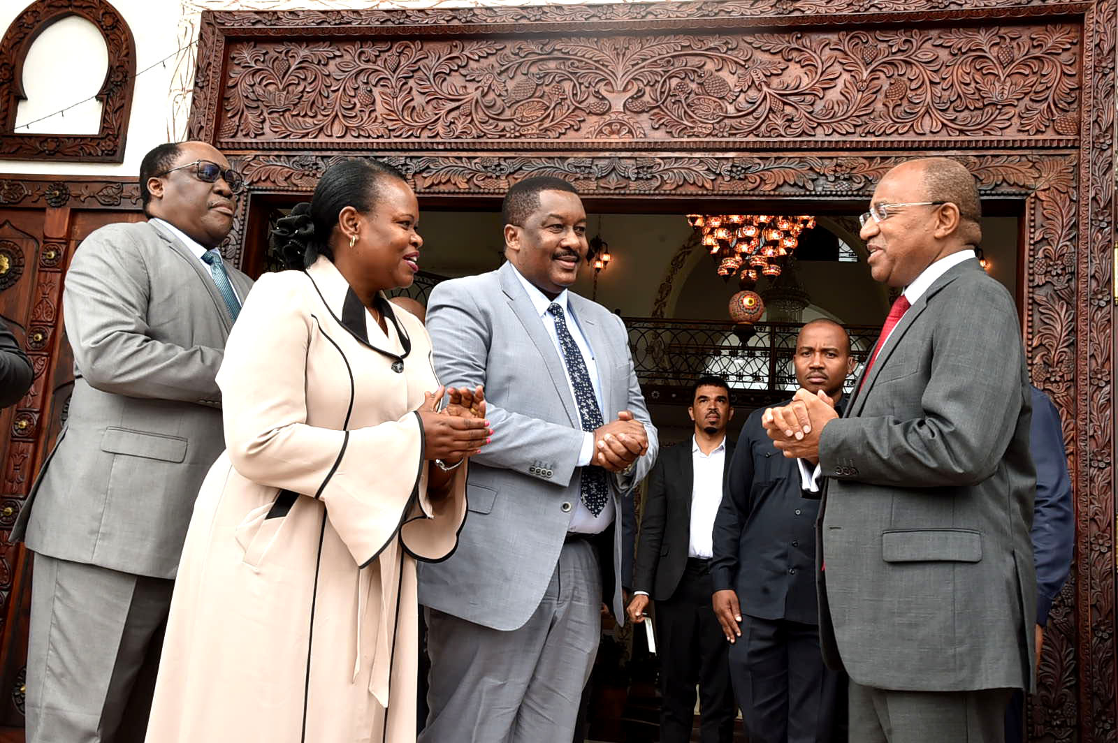 Rais wa Zanzibar na Mwenyekiti wa Baraza la Mapinduzi Dk.Hussein Ali Mwinyi akiteta na Msajili wa Vyama vya Siasa Mhe.Jaji Francis Mutungi mara baada ya kufungua kikao cha siku mbili cha zarura cha Baraza la Vyama vya Siasa leo katika ukumbi wa Madinat Al Bahr Hotel nje ya Jiji la Zanzibar.