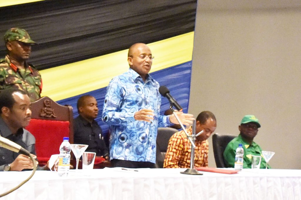 Rais wa Zanzibar na Mwenyekiti wa Baraza la Mapinduzi Dk.Hussein Ali Mwinyi akizungumza na Viongozi na wananchi na watendaji mbali mbali katika mkutano wa majumuisho ya ziara yeke ya kugagua miradi ya maendeleo Mkoa wa Kaskazini Unguja huko Ukumbi wa Hoteli ya Melia Zanzibar Pwani mchangani,(kulia) Mwenyekiti wa CCM Mkoa wa Kaskazini Unguja Mhe.Iddi Ali Ame,Waziri wa Nchi Ofisi ya Rais,Tawala za Mikoa,Serikali za Mitaa na Idara maalum za SMZ Mhe.Masoud Ali Mohamed.